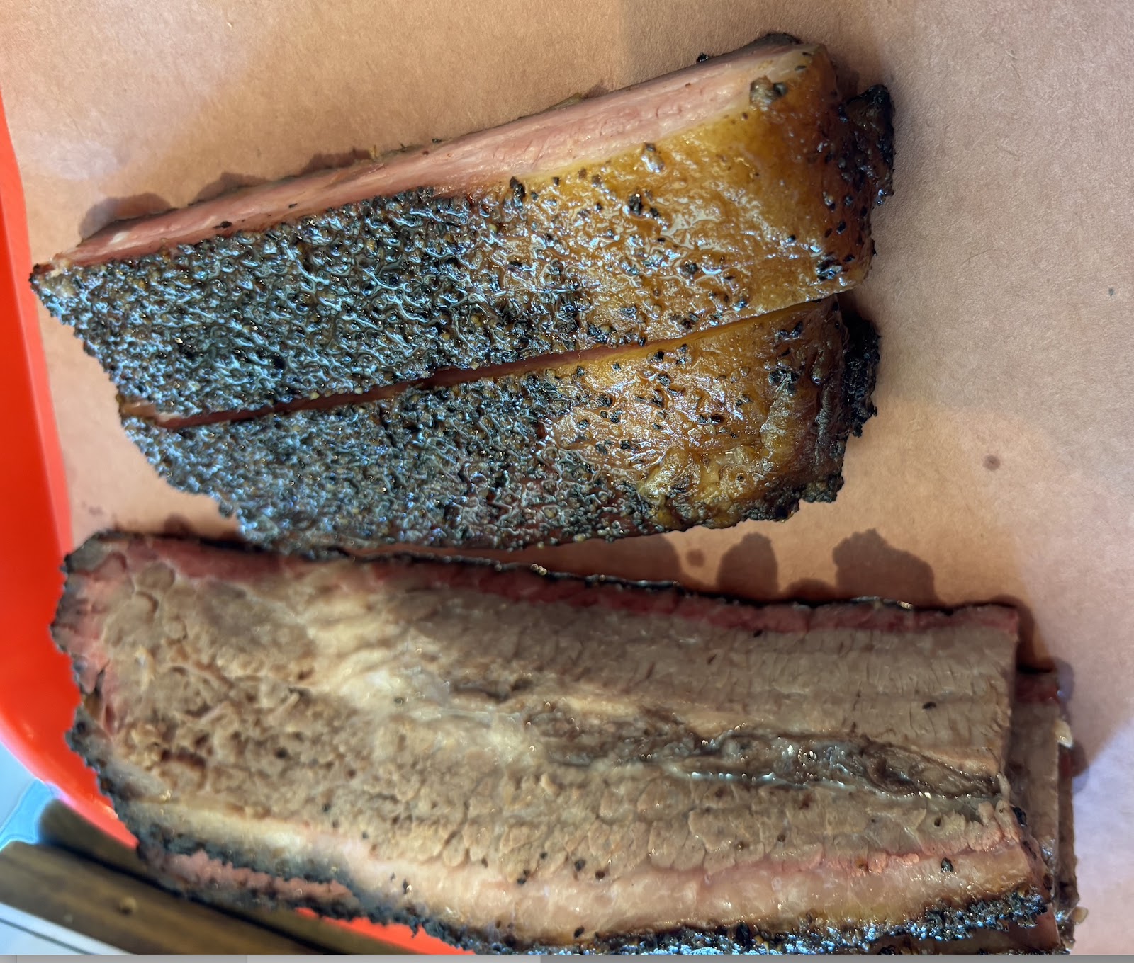- Beef Brisket - My coworker, Daniel, had told me to ask to mix in fatty parts - fatty 40 lean 60, so I did just that and the ladies at the cutting station looked at me with puzzled faces. Maybe it would have been better to educate me that I can just ask for lean or moist (I learned about this later), but they seemed a bit annoyed with my ask. The lady cutting the brisket asked how many slices we wanted so I asked her to show me how big a slice was. The first piece she cut was on the edge of a just cut piece of brisket. When she showed me that piece, I asked for four, but as the slices got progressively larger and thicker, I knew that was going to be too much. I asked for less, but she insisted that even with the ribs, that was just right for two people. I didn't feel heard and I ended up with more than a pound of meat. It wasn't about cost, but as I knew I would be traveling and didn't have any type of cooler, and that dinner would be early tonight, this was way too much food. The brisket was tender and smoky, but on the salty side. The barbecue technique looks good with the pink ring on the surface of the smoked meat. Sauces were tangy - I needed some sauce to balance out the salt. Even though I the brisket had fat in it, it dried out during the course of the meal so that it wasn't so moist anymore. Okay, but not the best brisket of the trip. $35/pound